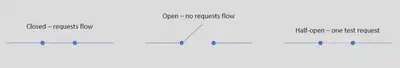 The Polly circuit breaker has the corresponding closed and open positions. When closed, the circuit breaker allows requests to be sent, when open, nothing can be sent and an exception is immediately thrown if a request is send to the circuit breaker.
