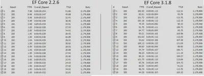 - EF 3.1.8 returns four requests in less than 100ms. The rest are in the 100ms to 115ms range.