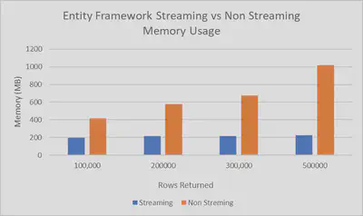 A while ago I wrote a blog post about the advantages of streaming results from Entity Framework Core as opposed to materializing them inside a controller and the returning the results. I saw very significant improvements in memory consumption when streaming as shown in the chart below.