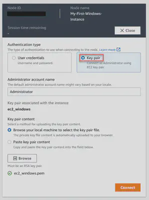 Finally, you need to authenticate yourself, you can use the key pair you generated when you created the instance, or another form of authentication like active directory credentials, or local machine credentials.