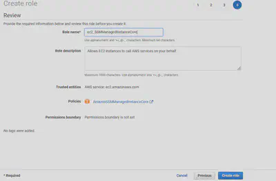 You can skip adding a tag, hit “Next: Review”. Now you’ll be on the review page, give the role a name, and hit “Crete role”.