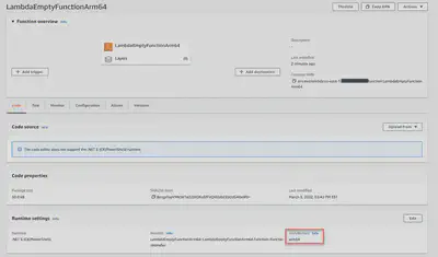 dotnet lambda invoke-function LambdaEmptyFunctionArm64 --payload "hello arm64"You should get a response that includes this -