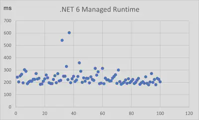 I created two Lambda functions, one with .NET 6 using the Lambda managed runtime, and the other with .NET 7 using a custom runtime and native AOT compilation. I then measured the cold start time of each function by forcing 100 cold starts for each function.